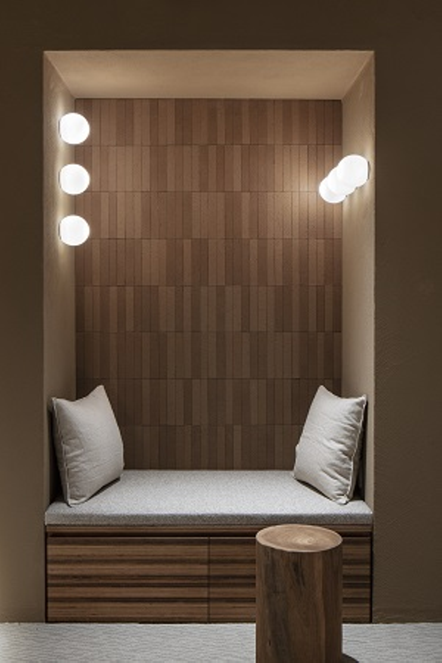 5つある丸太のテーブルは、壁のタイルのような小さいものを集めて作ったものとは対照的に、1つのアイテムだけで存在感があり、それ自体が空間の中で愛着の湧くアイテムになると考え設置しています。