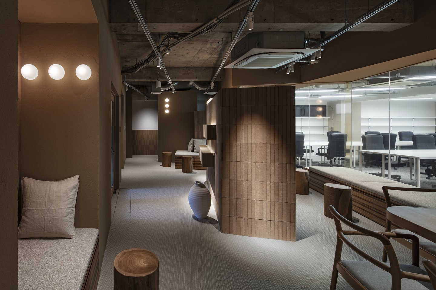本社オフィスの休憩室はオープンでウェルカムな印象があり、居心地の良さが感じられます。それに対して、地層オフィスは「オープン過ぎず来客者から見られることなくゆっくり休むことのできる居場所」になるように設計しています。