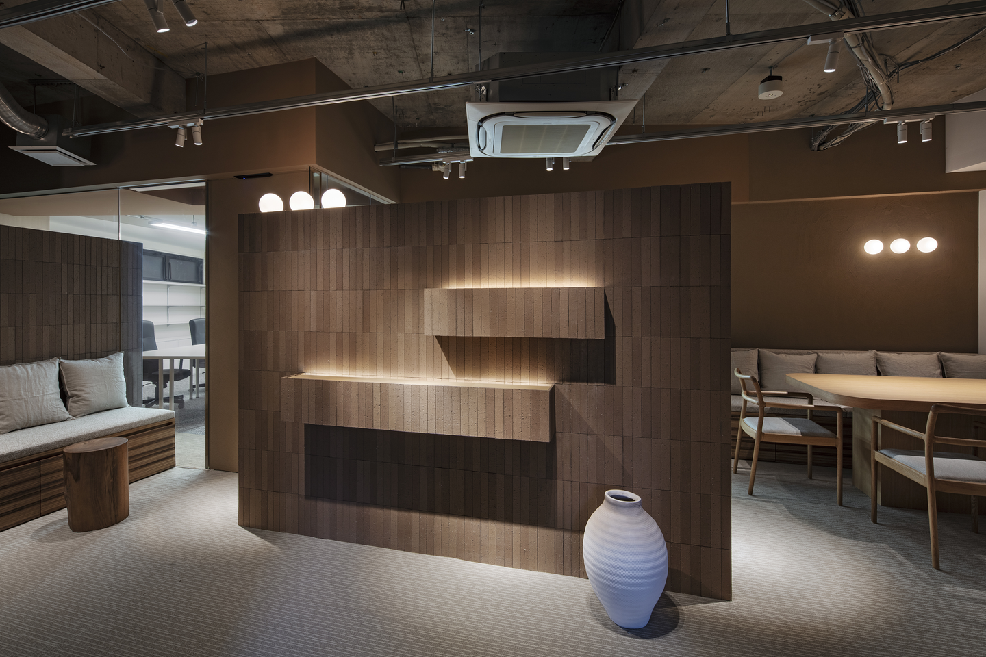 オフィスの顔でもあるエントランスは、地層が持つ“土や木材の温かみ”に、“先進的で洗練されたイメージ”を加えてデザインしました。