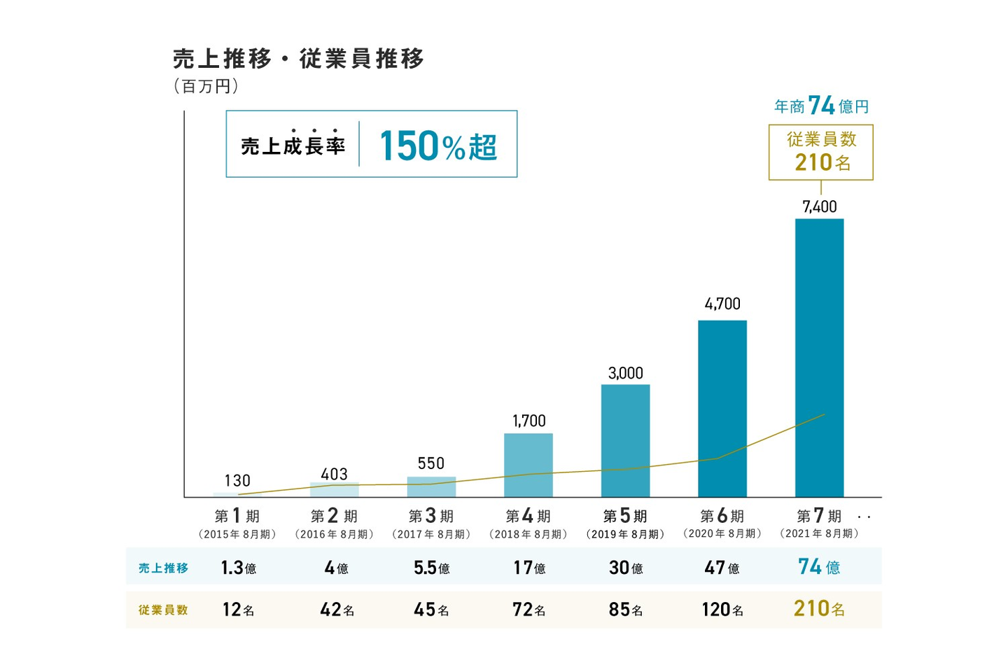 上図のように、7期目の売上高は157%成長し74億円で着地しました。