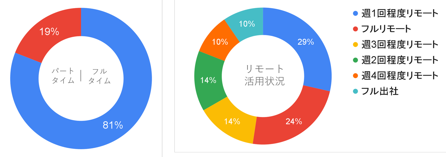 パートタイムのメンバーはフルリモート。フルタイムのメンバーは週1~3程度リモートしているメンバーが1番多い数値となりました。