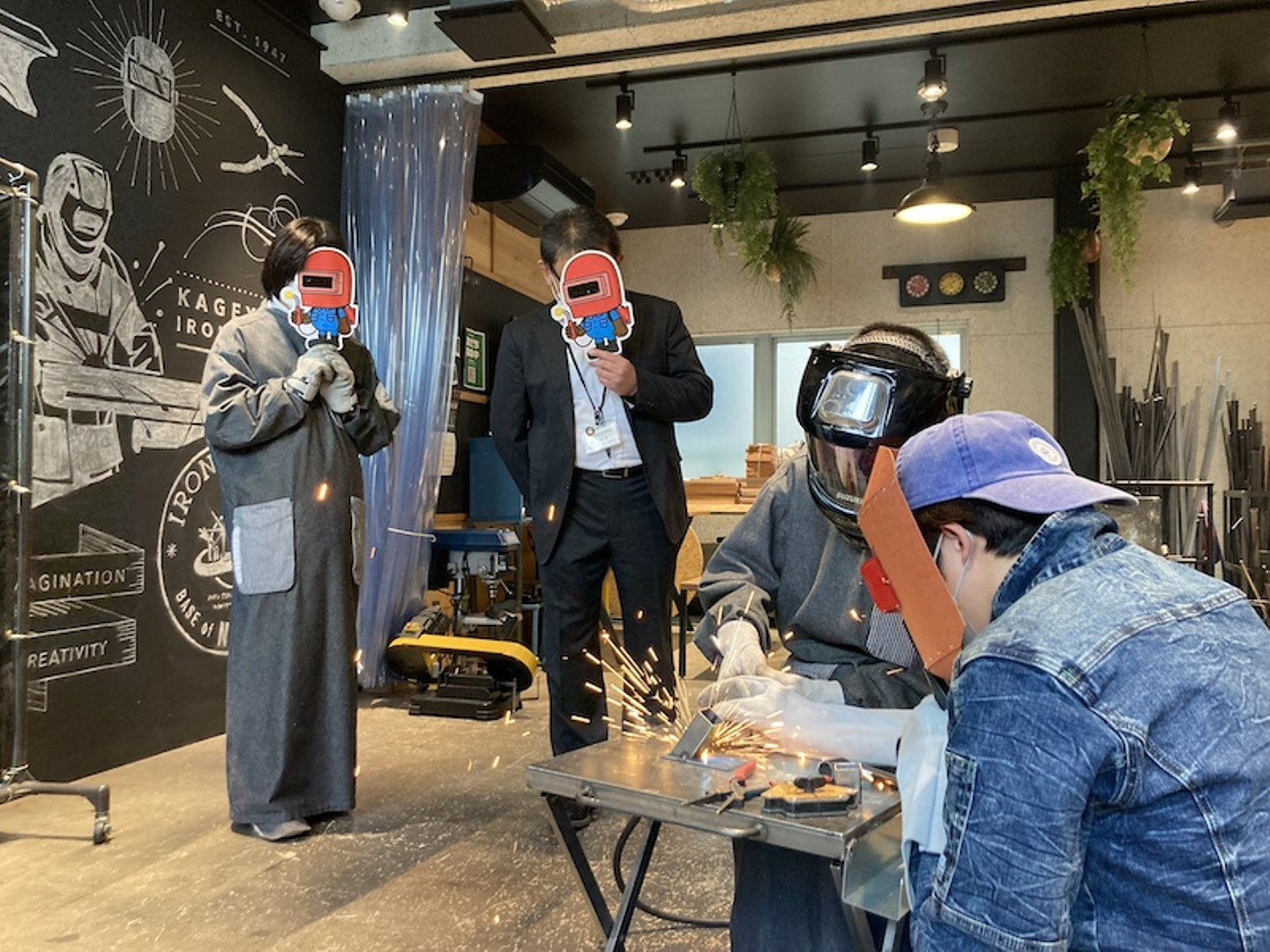 事務所に併設されている溶接体験工房のアイアンプラネットで実際に溶接を体験してもらいながら、ペン立てを製作しました。実際に体験することによって溶接のかっこよさや楽しさ、難しさを体感していただきました。