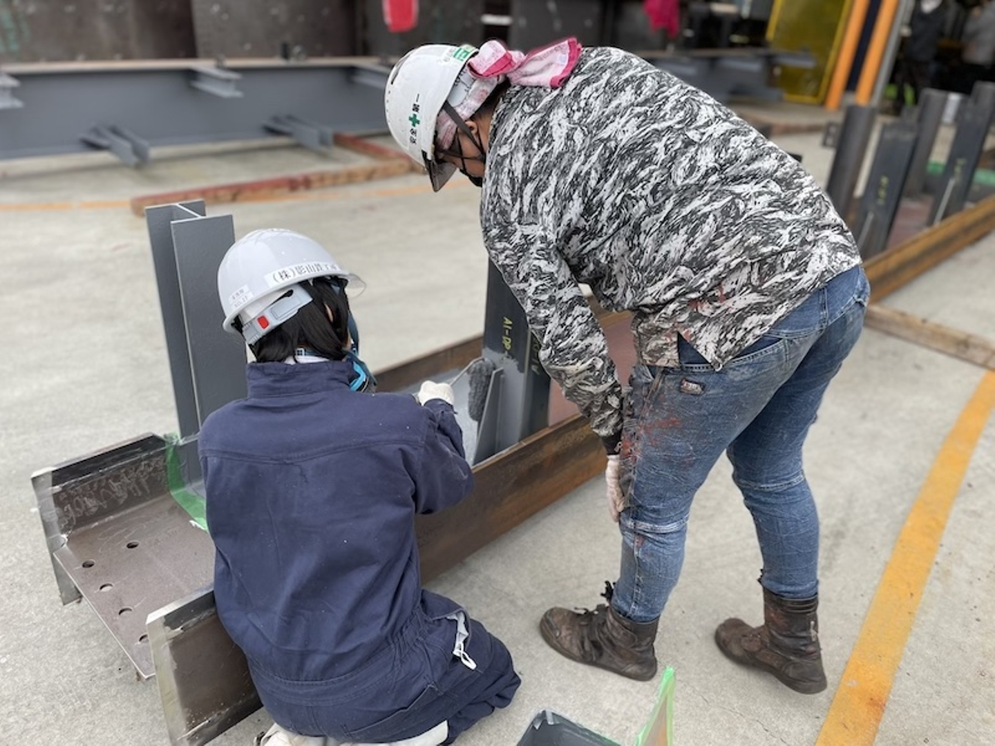 鉄骨の塗装を体験してもらいながら、塗装をする箇所としない箇所がある事や塗り残しがあるとそこが錆に繋がってしまうこと、あえて塗装しないことで錆びさせ接着剤の役割をさせている箇所があることを学んでいただきました。