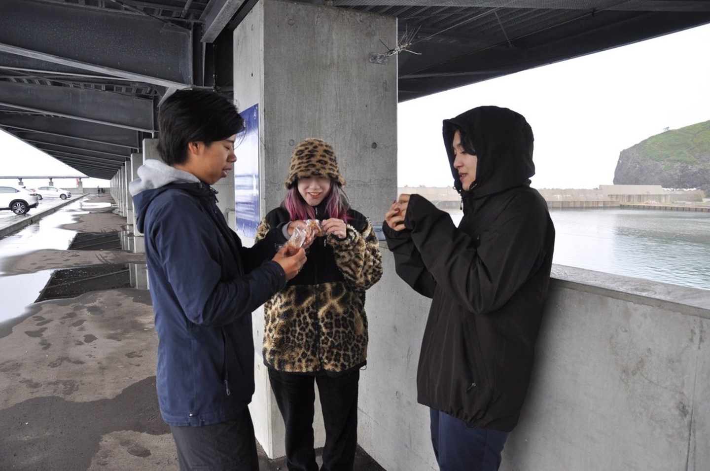 早朝ウトロで鮭の水揚げ見る前におにぎりタイム(めちゃ寒かった 気温10°C以下)