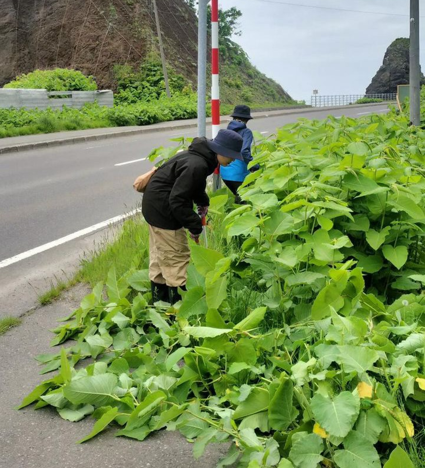 斜里町ウトロにて、ヒグマが隠れやすい背の高い「虎杖(いたどり)」という雑草を刈る活動へ参加