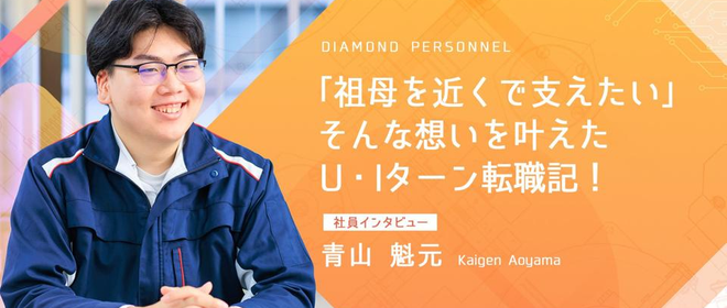 当社のストーリーをご覧いただき誠にありがとうございます!『ダイヤモンドパーソネルってどんな会社なの?』という疑問にお答えしていくこの企画!今回は2024年にU・Iターン入社し機械設計エンジニアとして活躍している青山さんに、いろいろとお話を伺ってまいりました!当社への転職をきっかけに変化した環境や働き方などをまとめたインタビュー記事となりますので、ぜひとも最後までご覧ください!!青山 魁元(Kaigen Aoyama)出身:愛知県社歴:入社2年目(2024年5月入社)所属:三菱電機エンジニアリング 静岡事業所休日の過ごし方:祖母と買い物や病院への付き添いをしています!1.祖母のいる静岡で、...