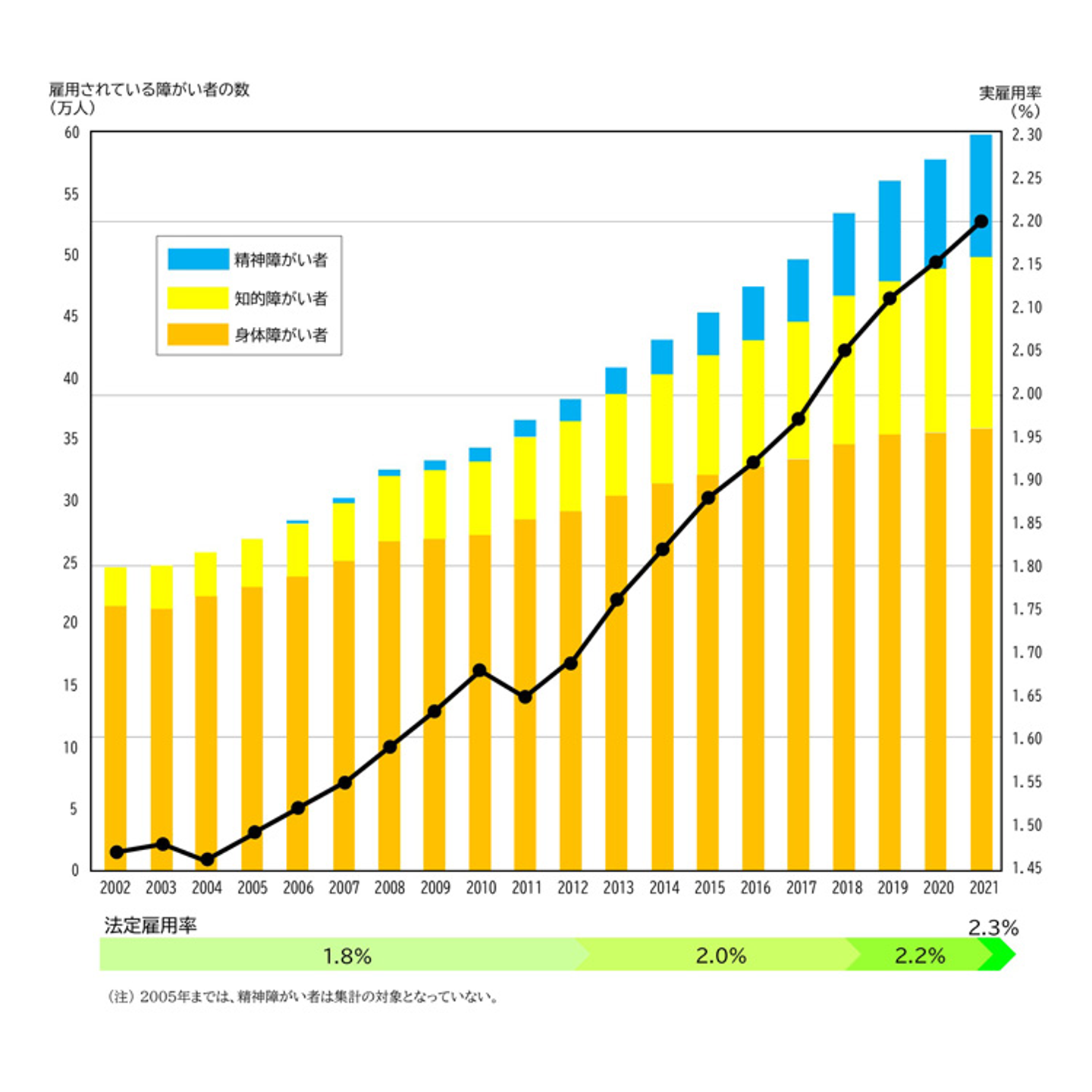 また、障害者雇用促進法では、民間企業や公的機関などの事業主に対し、常時雇用する従業員の一定割合(法定雇用率)以上の障害者を雇うことを義務付けています。しかしながら、雇用の大部分を占める民間は、まだ法定雇用率2.3パーセントをクリアできていません。10年前に比べて増えてはいるものの、幅広く活躍する環境には至っていないのが現状です。