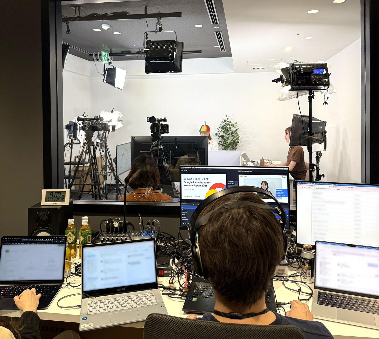 配信スタジオの様子。複数のカメラやスイッチャーを使用した配信体制で、参加者からの質問にも随時対応しながらイベントが進行しました。