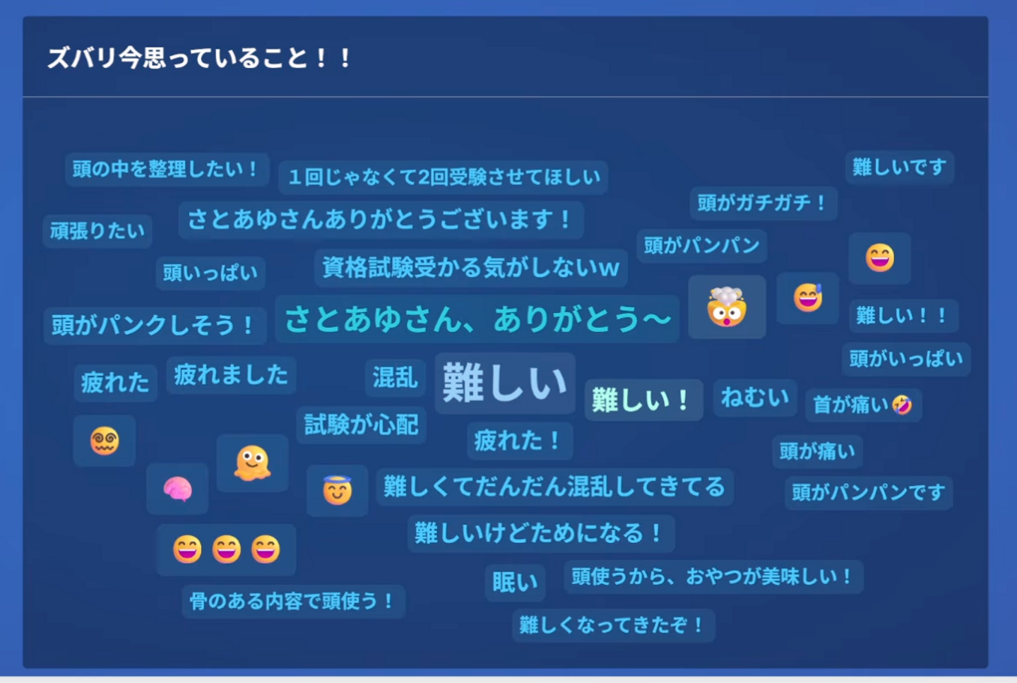 参加者の皆さんから寄せられたリアルタイムコメント。「難しい」「頭がいっぱい」といった声を投稿しながら、参加者同士で励まし合うような雰囲気も。