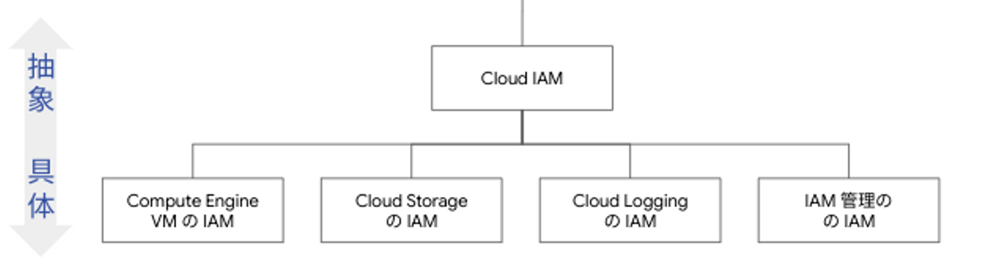 そうすると、今まで検討していなかった Cloud Logging や、Cloud IAM 自体を管理する IAM まで検討できるようになりました (本当は水平方向に、考慮事項がもっとたくさんありますが省略)。Cloud IAM の上にはさらに線があり、さらに抽象度を上げられそうです。
