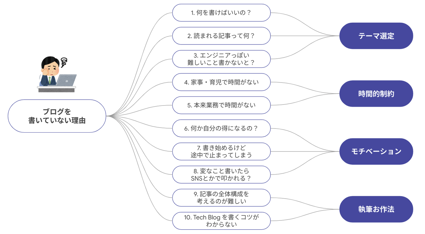 今まで漠然と「忙しいから」など理由をつけて技術ブログを書いていませんでしたが、理由を明確にすることで打開策を考えることができます。