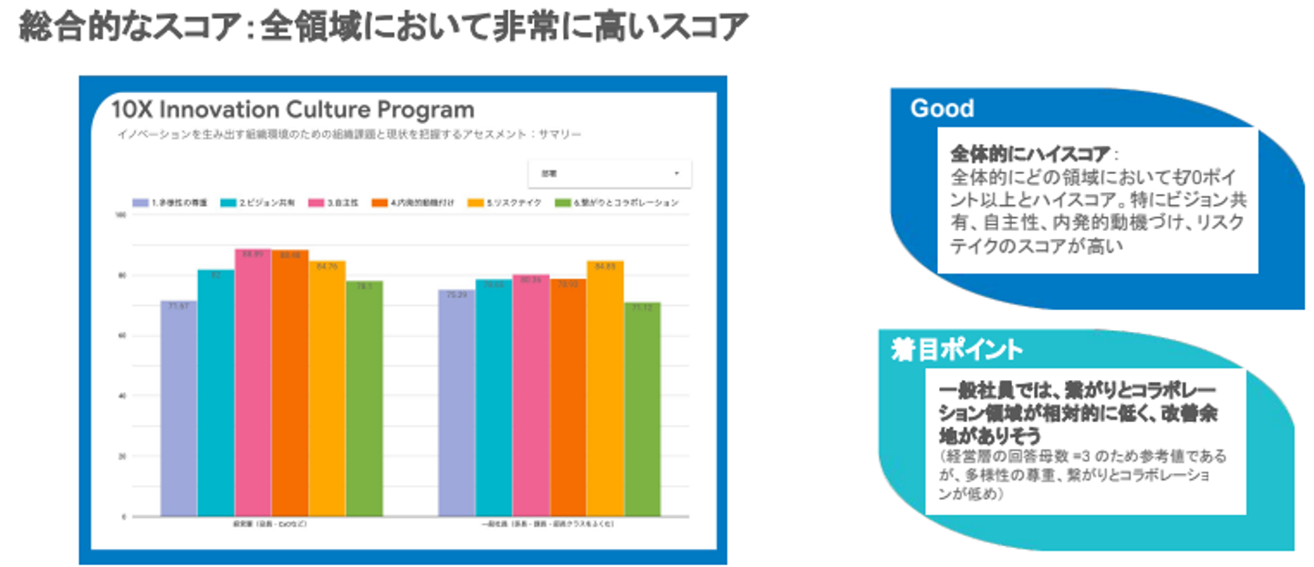 また、グラフから経営層、一般社員共に全領域において非常に高いスコアを有していることがわかります。一方、相対的に見て、「つながりとコラボレーション」が低い傾向にあり、改善余地があることが見て取れます。