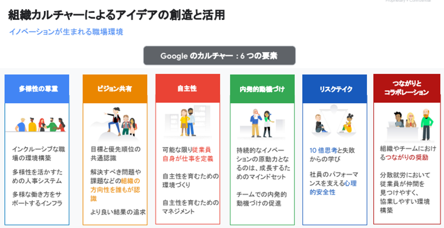 Google が長年の研究やリサーチを重ねて導き出した、イノベーションを創出する上で重要とされる以下の 6 つの要素について、Google の事例も交えながら説明いただきました。