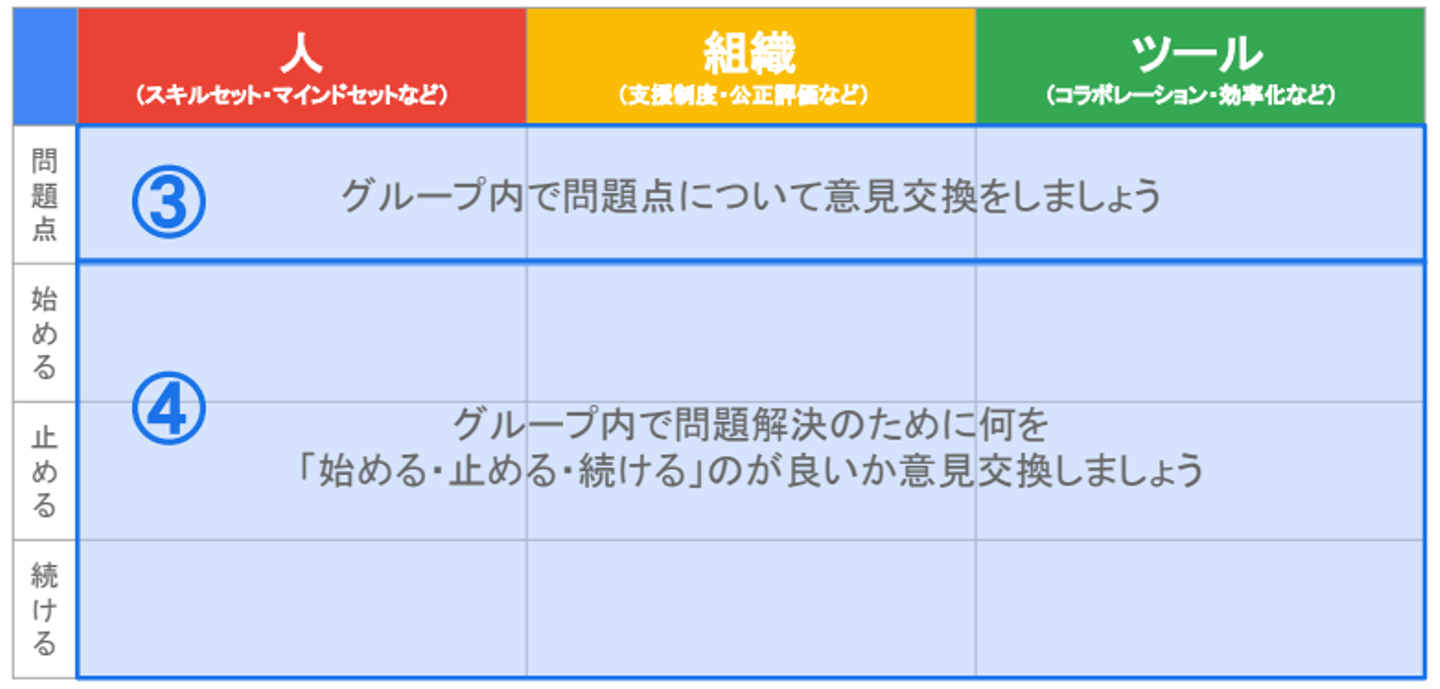 人・組織・ツールという切り口で、現状の課題を挙げ、それらの問題を解決するために、始めること、止めること、続けることは何かという流れで具体的なアクションにまで落とし込みを行いました。