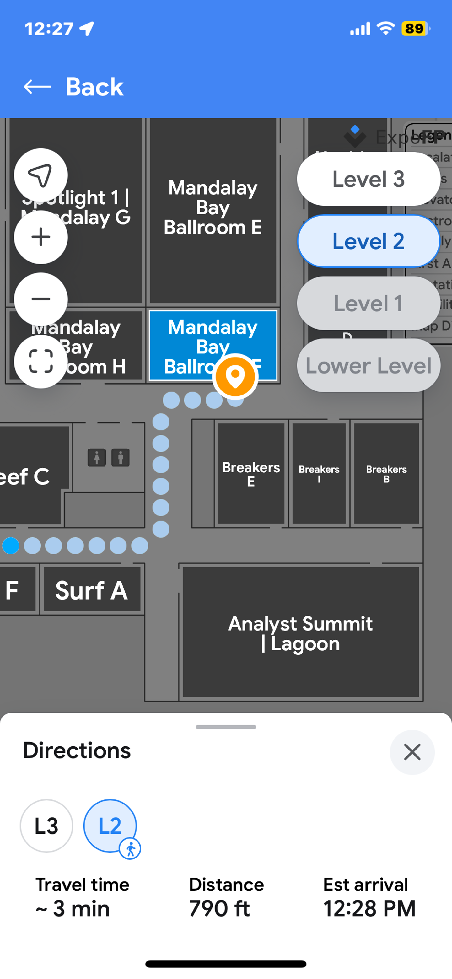 Next 専用アプリからは登録しているセッションの予定や、会場内のマップが確認できるようになっています。また、会場のマンダレイベイホテルはとても広く当日は通れない通路もあるため、現在地からセッション会場までの案内を行ってくれます。