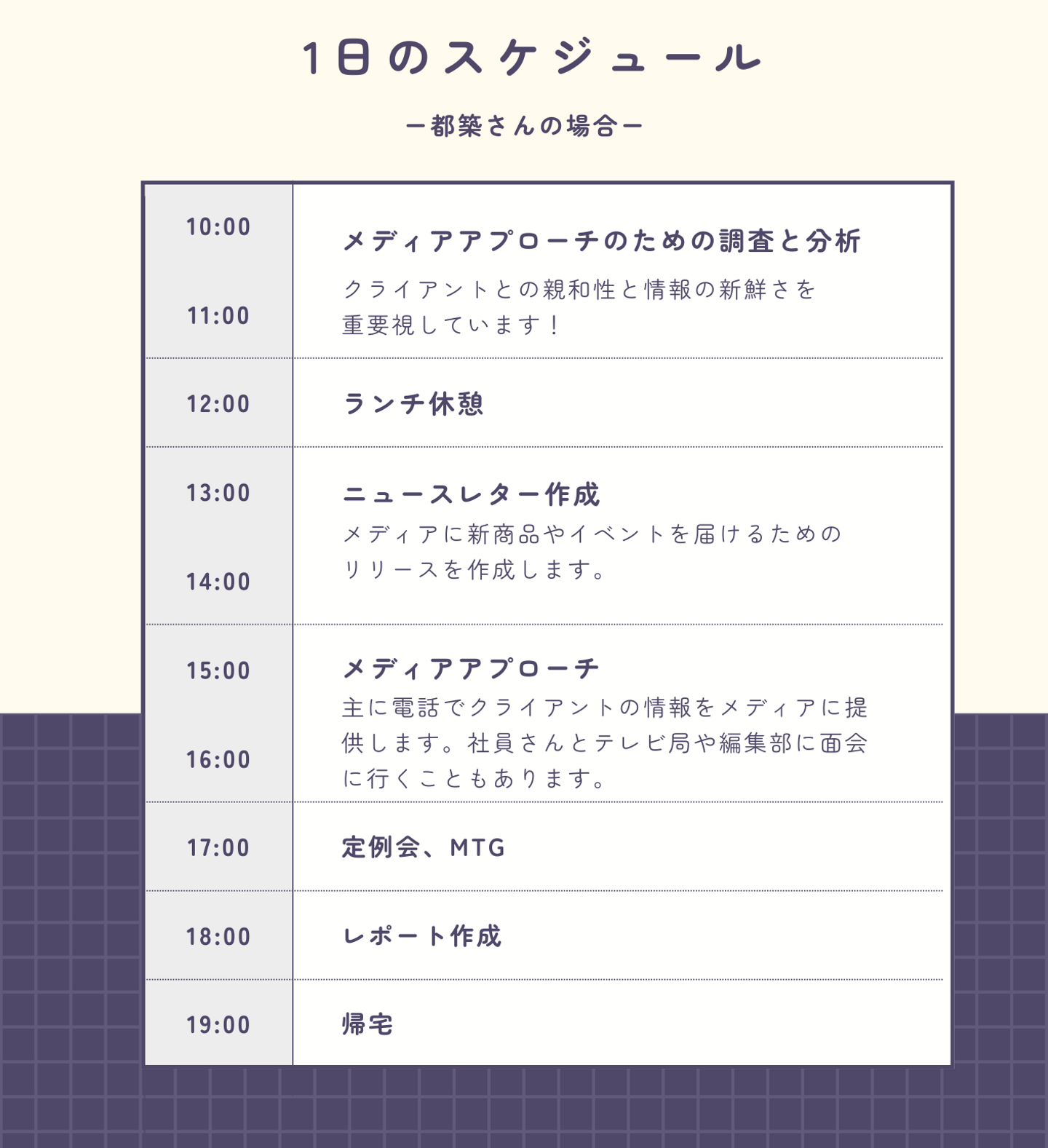 都築さん:PR業界に興味がある方はもちろん、コミュニケーション能力が高く、学び続ける意欲がある方にもぴったりです! 理論的な学びより実践的な探求ができる機会が多いので、実際の業務を通じてスキルを磨きたい人に最適です。