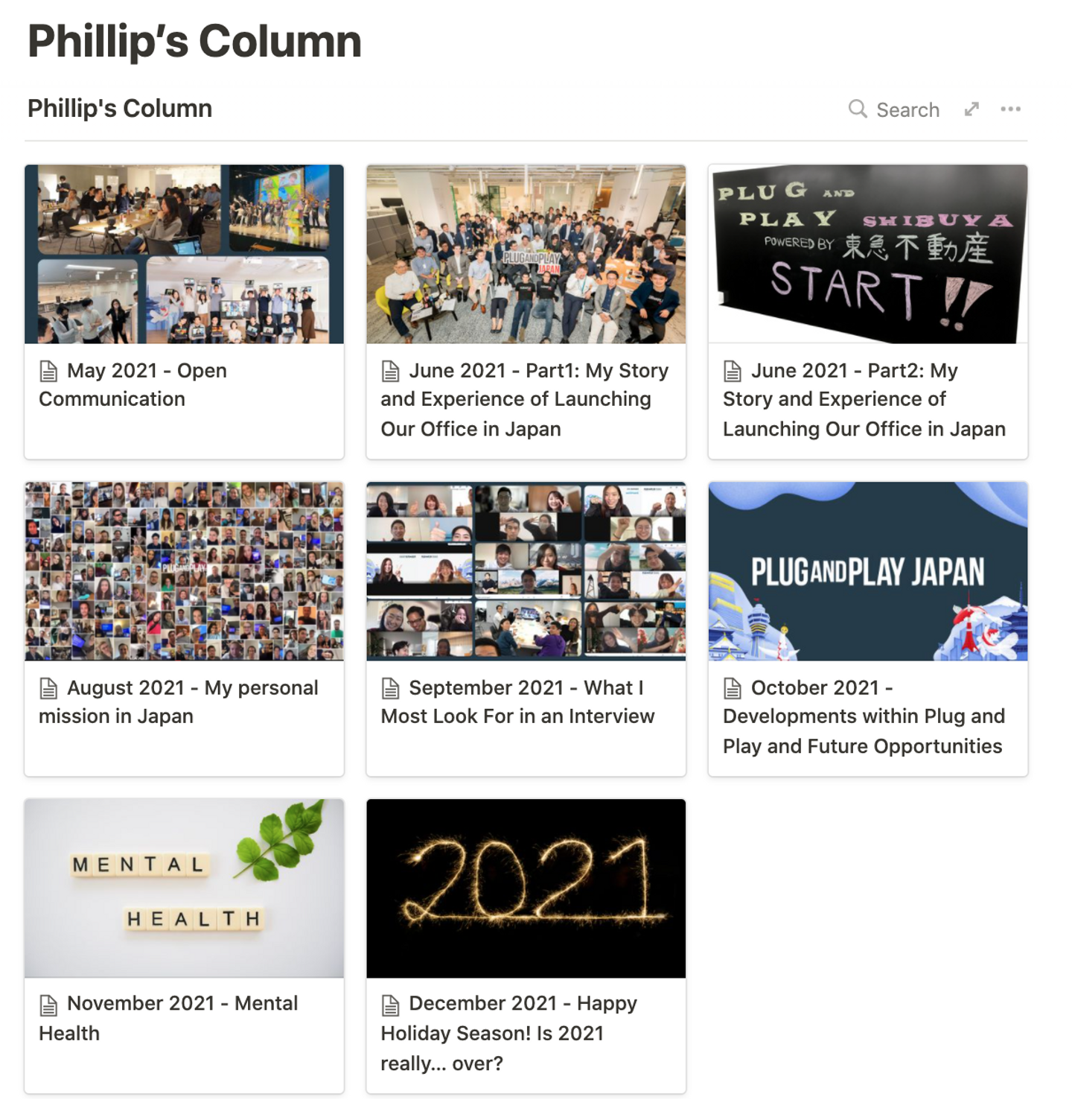 Plug and Play Japan代表のPhillip(社内では”フィリップ” “フィリップさん”とファーストネームで呼ばれています)はとてもフレンドリーな方ですが、メンバーが50人を超え、かつリモートワークの状況では一人一人と向き合うことが難しくなってきました。そこで5月からスタートしたのがPhillipによるマンスリーコラム。テーマに沿って直筆のメッセージをイントラネットであるNotionで全社公開しました。
