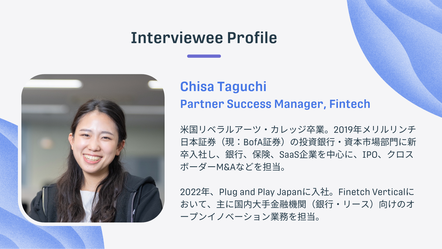 今回は、投資銀行を経てPlug and Play JapanのFintech Vertical(フィンテック・バーティカル)*にてPSを務めるChisaさんに「仕事内容」と「Plug and Play Japanで働く理由」についてお話を聞きました。