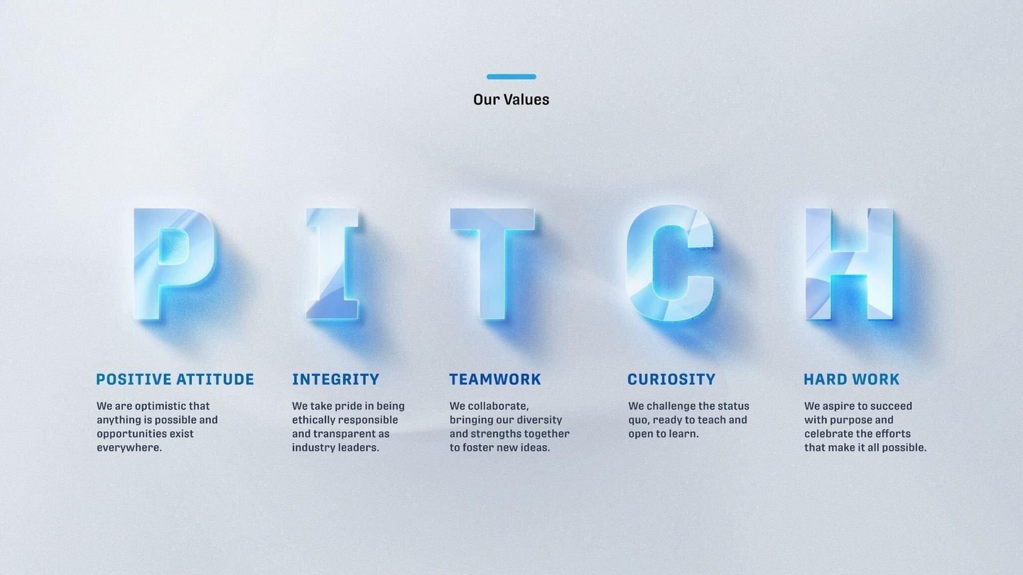 PITCHとは、「Positive」「Integrity」「Teamwork」「Curiosity」「Hard Work」の5つの言葉の頭文字を取ったもので、それぞれの意味は以下の通りです。