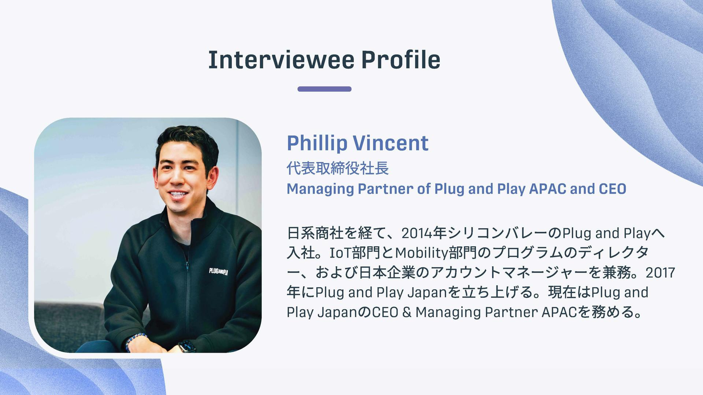 Plug and Playは、イノベーション・プラットフォームとして、スタートアップ・大手企業・投資家をつなぎ、世界中のイノベーションを加速させることをミッションとして掲げ、2006年にシリコンバレーで創業しました。現在、世界60拠点以上で事業を展開し、メンバーの国籍や言語、文化的背景や価値観もさまざまです。この多様性こそがPlug and Playの独自性の源泉にもなっています。多彩なメンバーが個性を発揮しつつ、組織として力を集結させ大きな成功を生み出していくうえで、会社共通の価値観であるValueが重要な役割を担います。今回、私たちのValueである「PITCH」についてPlug and Play Japanの代表であるPhillip Vincentに話を聞きました。
