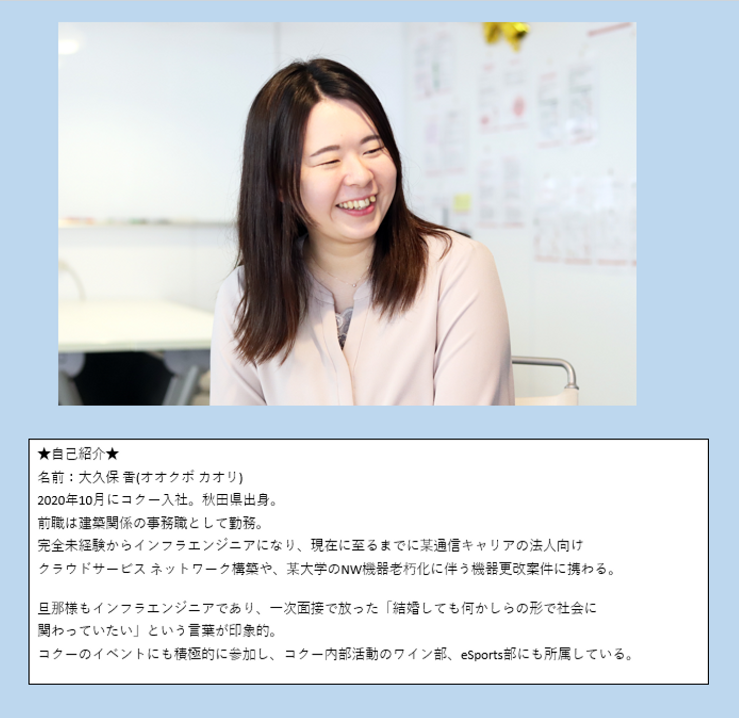 インフラエンジニアは日々勉強の積み重ねであることはもちろんですが、身についたスキルは一生ものになると思いますし、女性は特に、どうしても休職が避けられない期間が発生することもありますが、ブランクがあっても復職しやすいことは大きな魅力だと思っています。