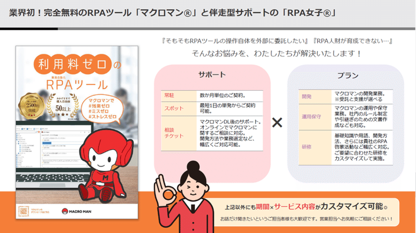 そのような想いからRPAツールを無料で提供しているのがコクーの「マクロマン」で、必要なサポートを受けられるのが「RPA女子」や「マクロマン相談チケット」なのです。
