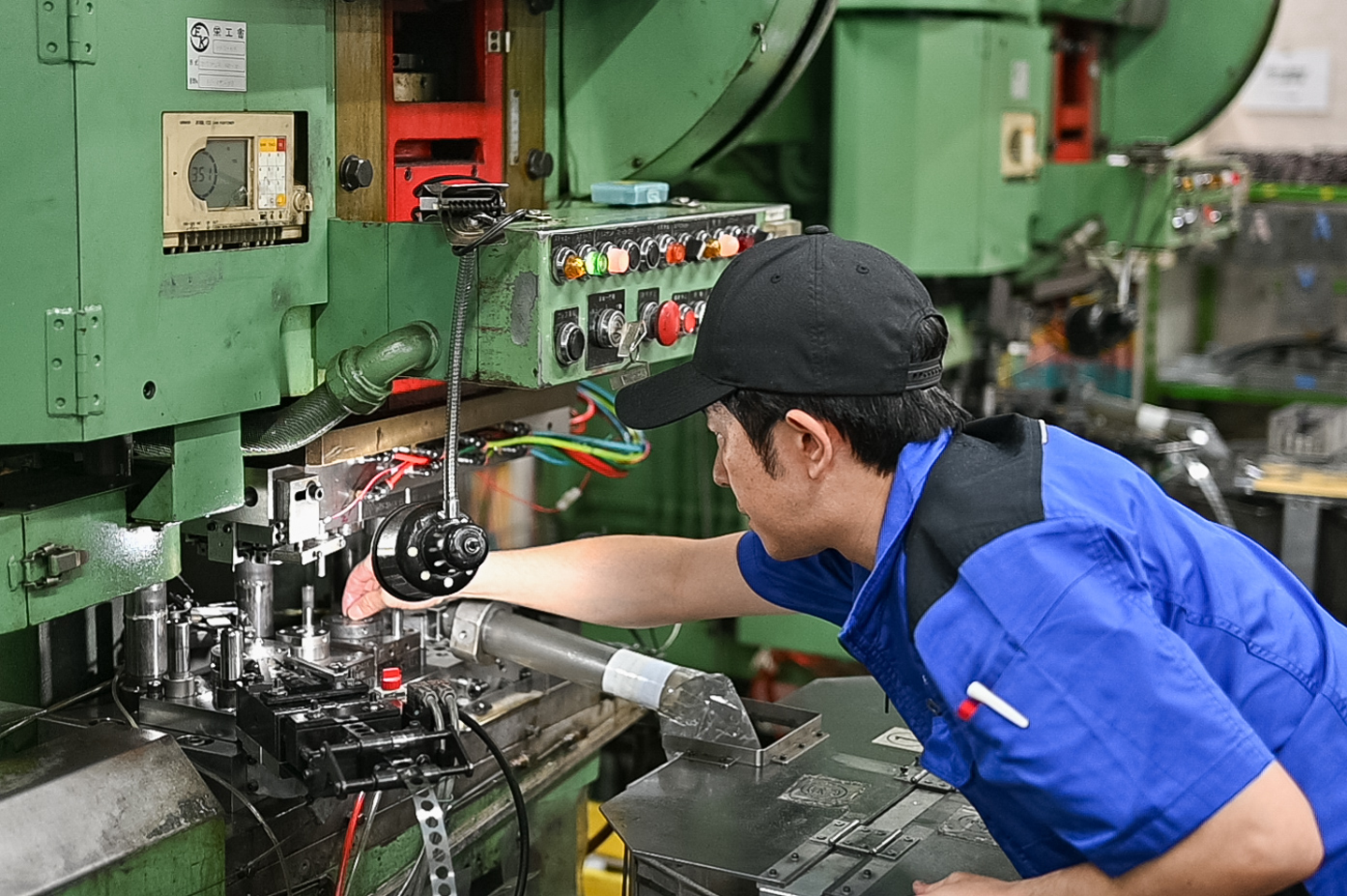 私は栄工舎のプレス生産課に所属しています。20年間、地下から3階までの生産に関するあらゆる工程を経験し、現在は1階のプレス生産を担当しています。私たちの製品は、地下で部品が作られ、1階でプレス加工されます。さらに2階でバレル研磨が行われ、3階で出荷準備が整えられるという流れです。この一連の工程を通して製品が完成します。プレス生産は、その中でも非常に重要な工程であり、生産のプロフェッショナルとして日々責任を持って業務に取り組んでいます。