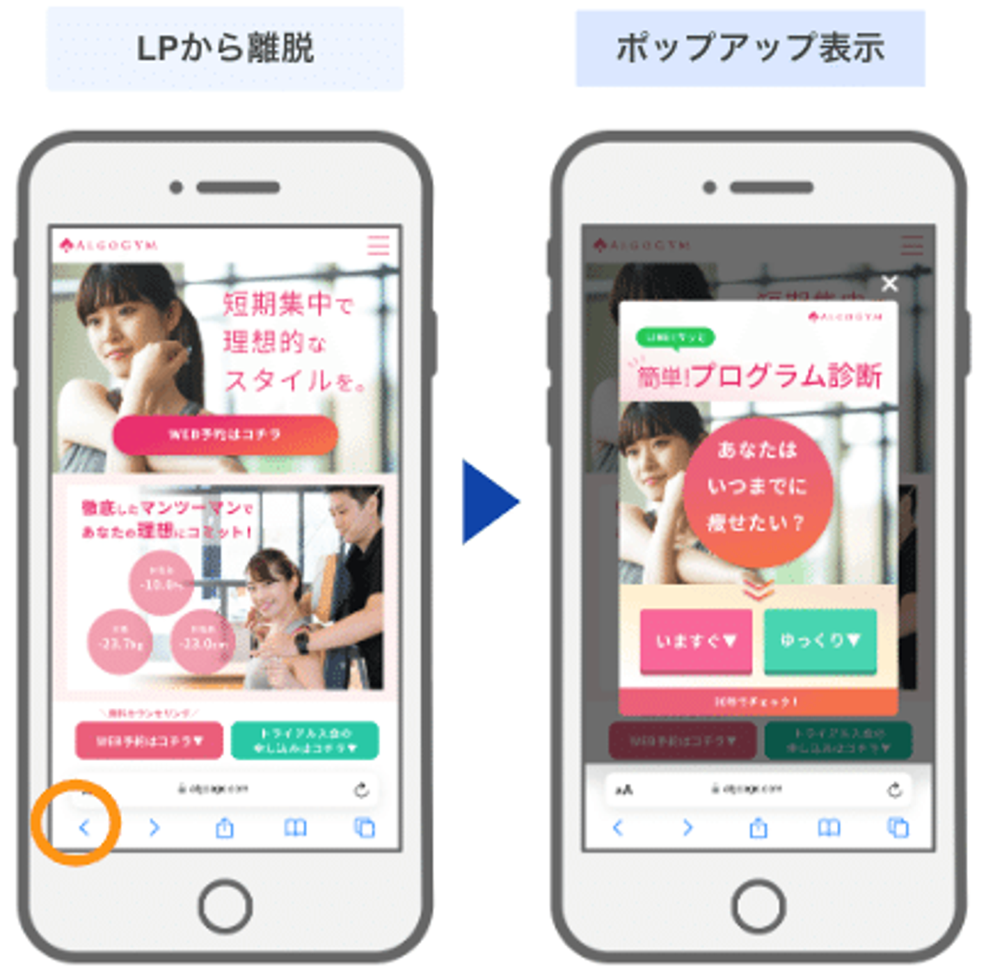 戻るボタンを押すユーザーに対して、ポップアップを表示させ、次のステップへ