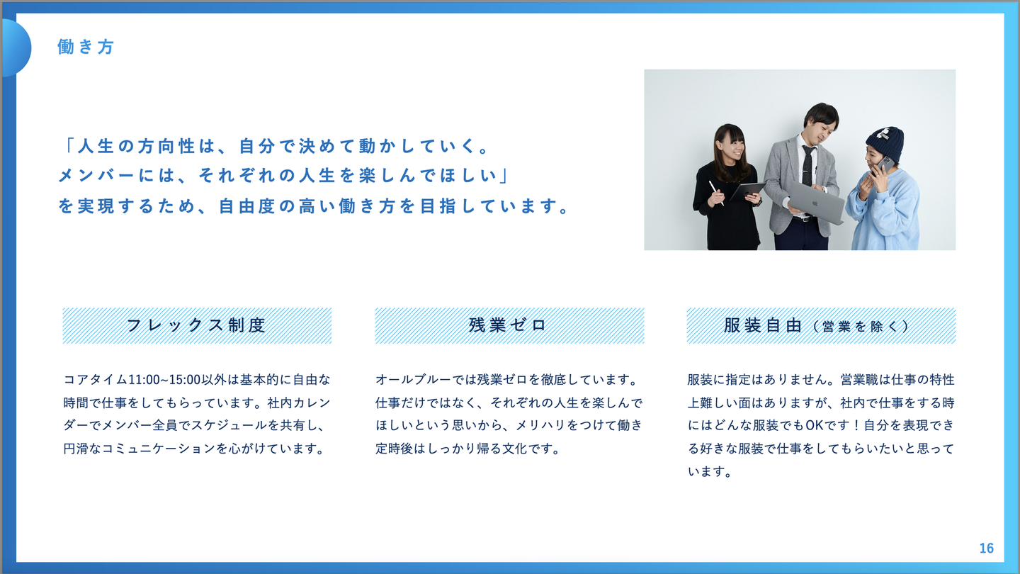 弊社の採用ピッチ資料でも働き方や社内のカルチャーについて詳しく記載しております。