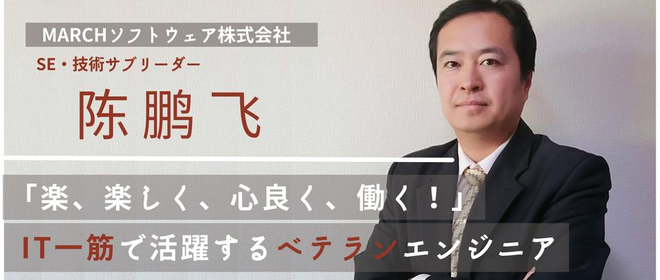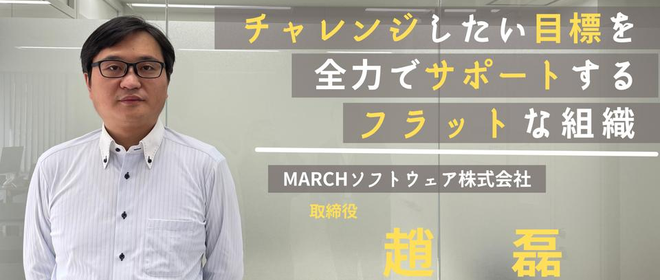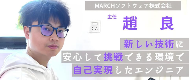 (1)「リーダーとしてプロジェクトに参画したい」強い想いを胸に入社したMARCHソフトウェア(2)新しい技術に安心して挑戦できる環境で、チームと共に成長する(3)仕事もプライベートも、両方で自己実現のできる場所、それがMARCHソフトウェア次の目標は課長になること。そう意気揚々と語ってくださった趙良さん。入社してから趙良さんが行った新しい挑戦、苦悩、そしてその先に見つけたやりがい。自らが体験したからこそ語ることのできるMARCHソフトウェアの魅力を、一挙大公開!・趙 良 主任平成3年生まれ、中国江蘇省出身。大学でソフトウェアエンジニアリングを専攻として勉強し、2015年に来日、物流・A...