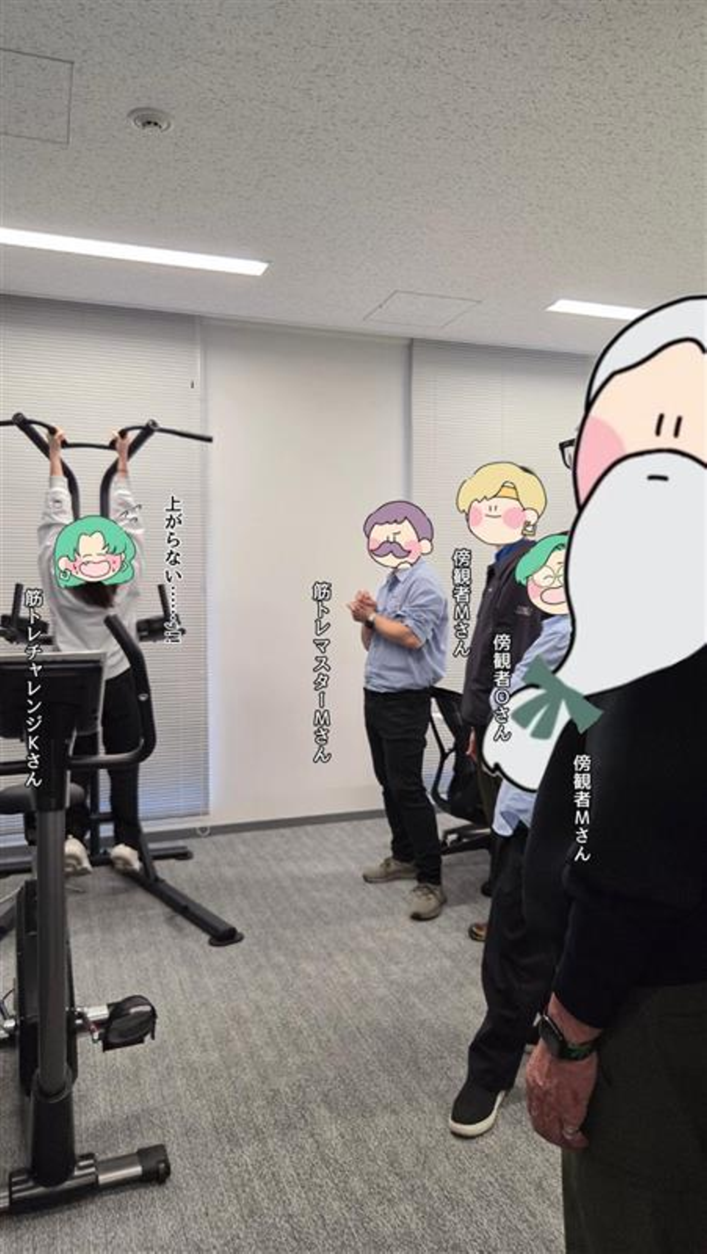 皆さんMさんの見よう見まねで懸垂してみるも全然ダメ🙅♀️