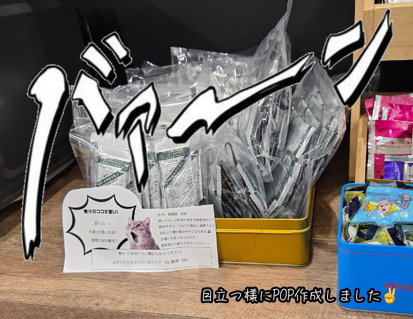 青汁だけではなく、社員個人が食べきれない量のお菓子などをもらったら