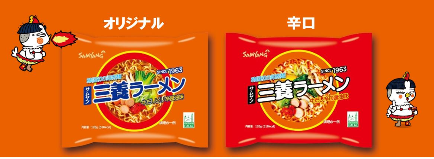 この赤とオレンジのパッケージ、辛そう、、、と思いますよね。でも心配ありません。上記図、左側の「三養ラーメン オリジナル(牛だしピリ辛醤油味)」は辛みは少なく、独自のハムと牛だし風味のスープはもちもちのちぢれ麺との相性抜群です!!あの日本でも有名な韓国ラーメンよりも辛みはかなり抑えられており、日本の方でもおいしくお召し上がれる味になっております。