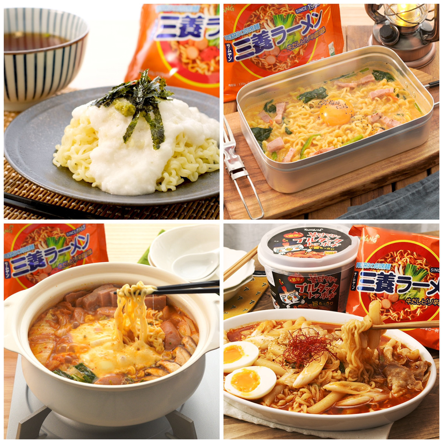このシンプルさ故、アレンジレシピの幅も広がっています!三養ジャパンの一つの大きな特徴でもありますが、ユーザーとメーカー一体となって、アレンジレシピの共有がなされています。イベントはもちろん、SNSや動画メディアでも積極的に発信しています。ラーメンだけではさみしい、という方こそぜひチャレンジしてみてください。下図はほんの一例ですが、つけ麺風、カルボナーラ風、ラッポッキ風etc...本当に同じラーメンで作ったと思えないほど、アレンジが楽しめます。