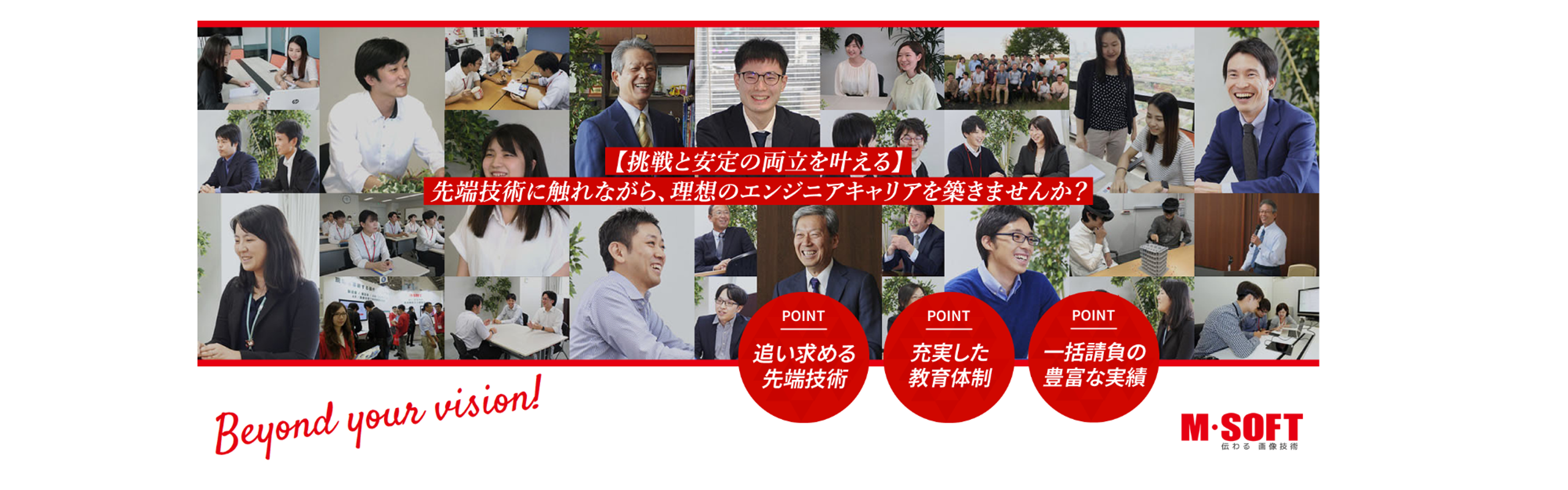株式会社エム・ソフトは「アイデアと技術で豊かな未来を創造し、全ての人を幸せにする」をミッションとして事業活動をおこなっています。この「全ての人」というのは「社員・顧客・社会」を指しています。 私たちはキヤノングループや大手メーカーといったプライム顧客を中心に安定した事業活動をおこなっており、エンジニアにとって安心してキャリアを築けるだけでなく、様々な仕事・技術に挑戦することが可能です。