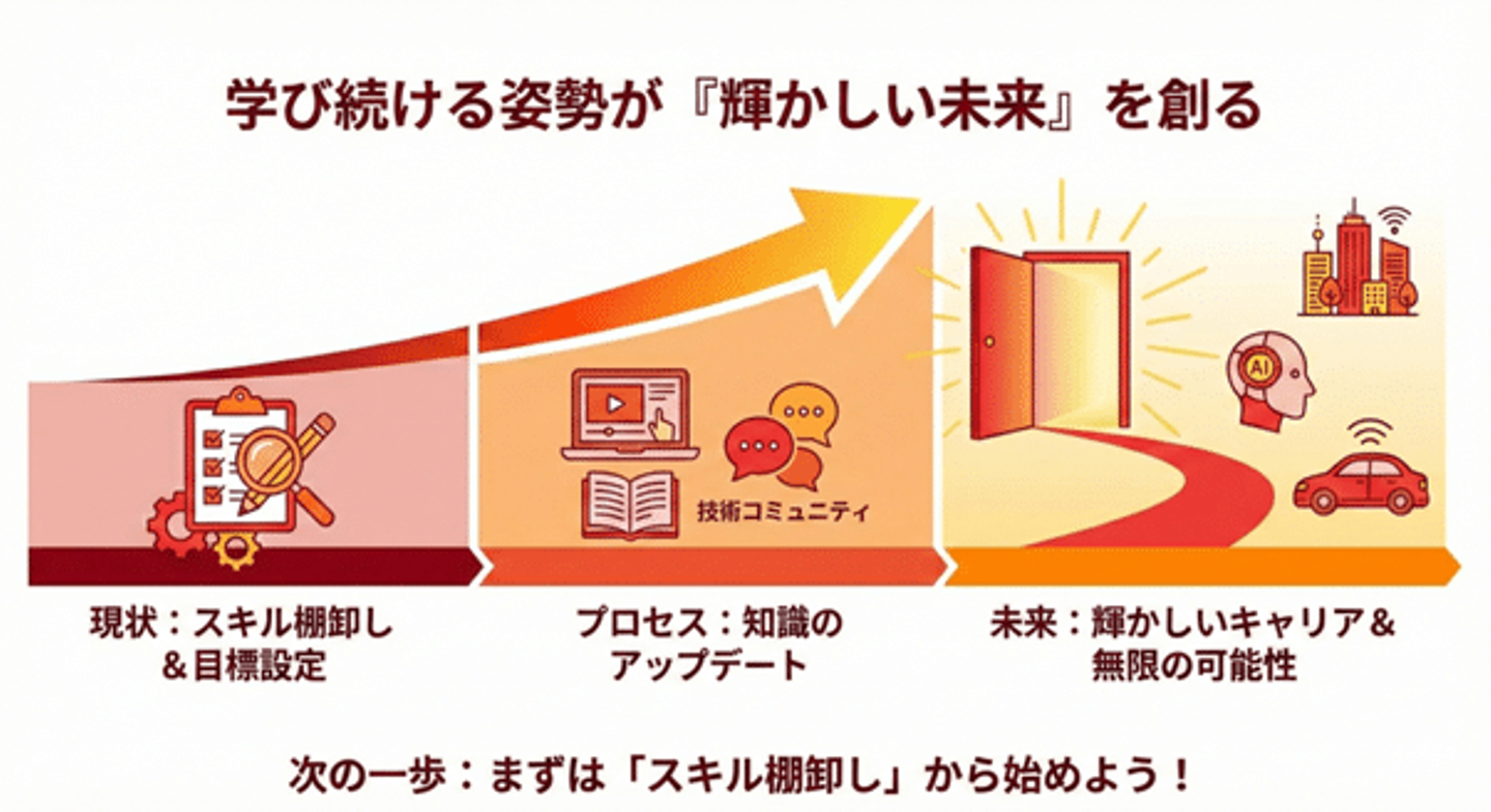 成功への第一歩は現状に甘んじることなく、自身のスキルを棚卸しし明確な目標を立てることです。オンライン学習プラットフォームやセミナー、技術コミュニティなどを積極的に活用し、常に自身の知識をアップデートしてください。