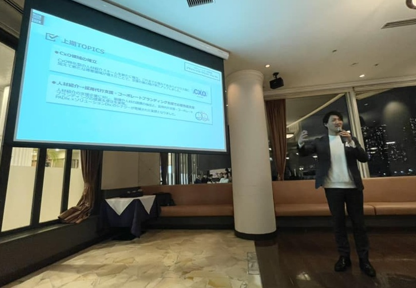 ソリューション事業(HR・マーケティング)、人材紹介事業、ヘルスケア事業、グローバル事業の4部門の代表者が、それぞれ上期のTOPICSや実績を発表いたしました。