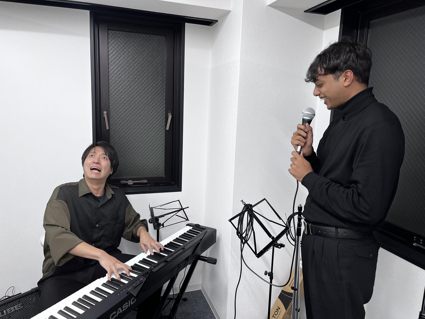 休憩時間ふざけている時の写真(左:柏崎(インタビュアー)、右:秋山さん)