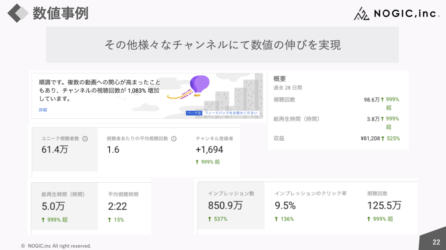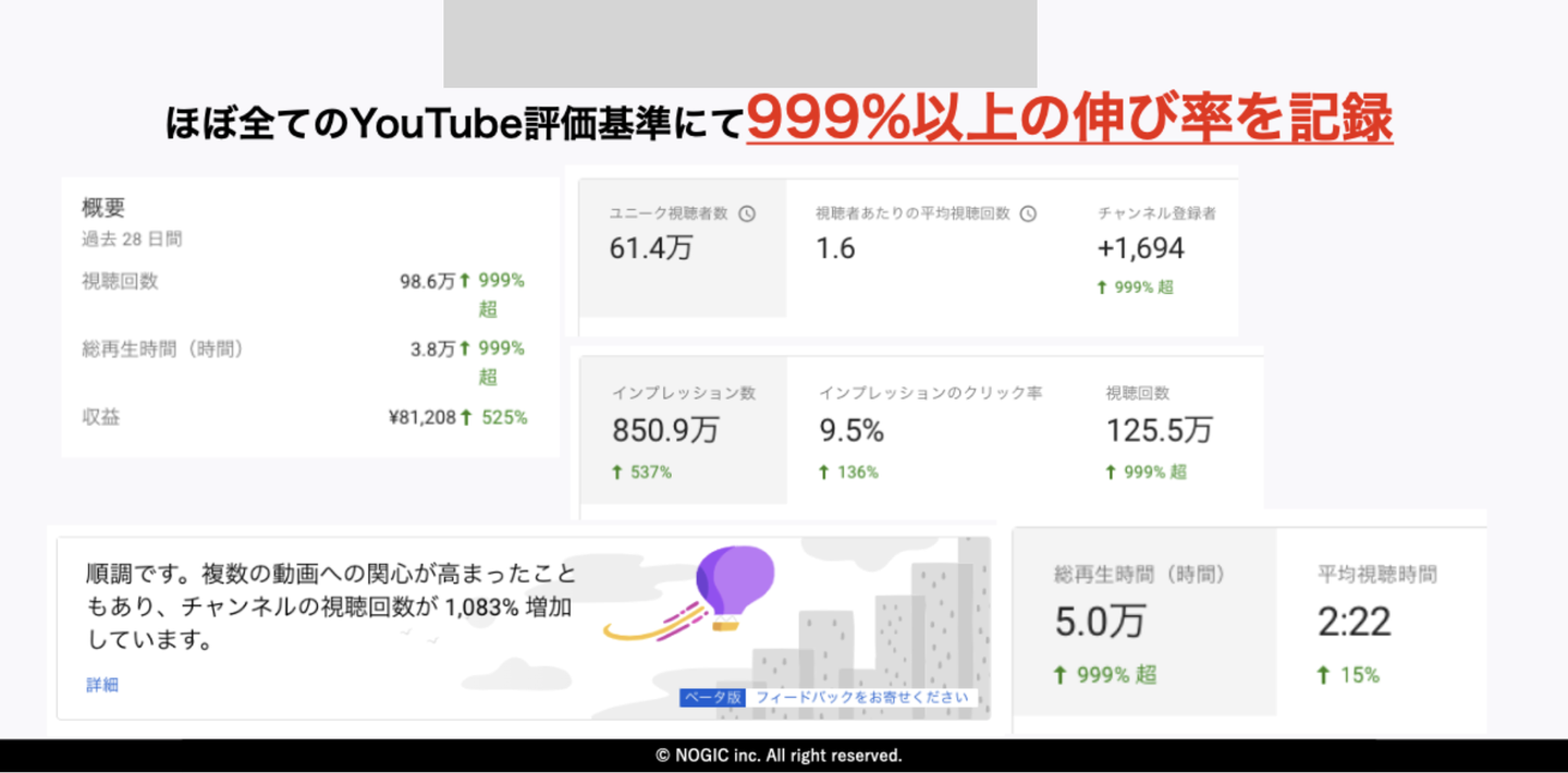 これはNOGICがYouTube事業を始めて一番最初に支援したYouTubeチャンネルです。NOGIC独自のフォーマットを使って1本目から立て続けに100万回再生を記録した結果、ほぼすべてのYouTube評価基準にて999%以上の伸び率を記録することが出来ました。
