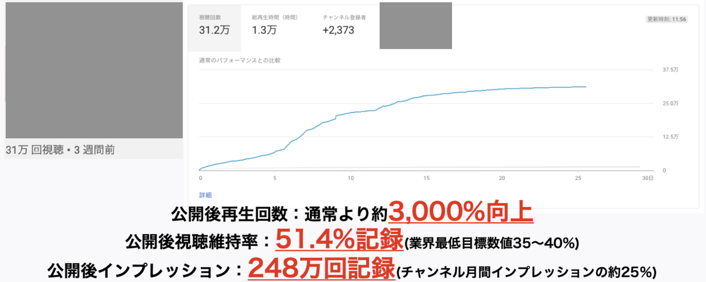このチャンネルは、公開後再生回数が通常より約3000%向上し、公開後の視聴維持率・インプレッションも高い数値を記録していきました。