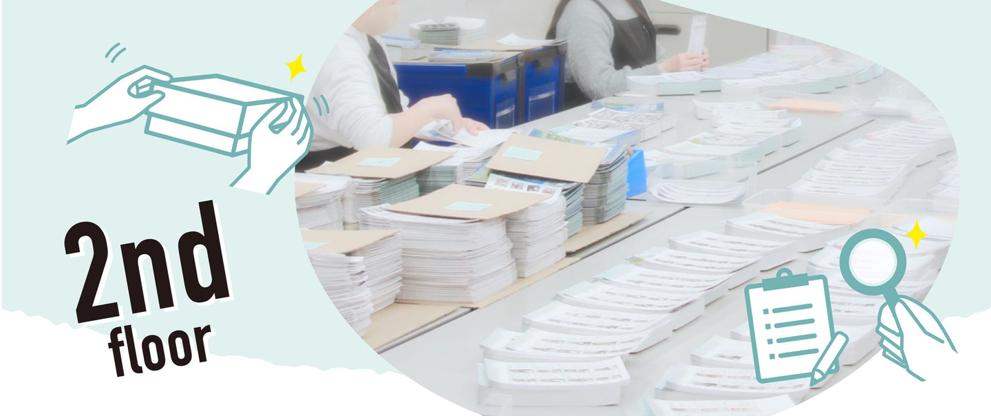 2F作業スペースでは、専属スタッフによる箱の組立て・セット組、