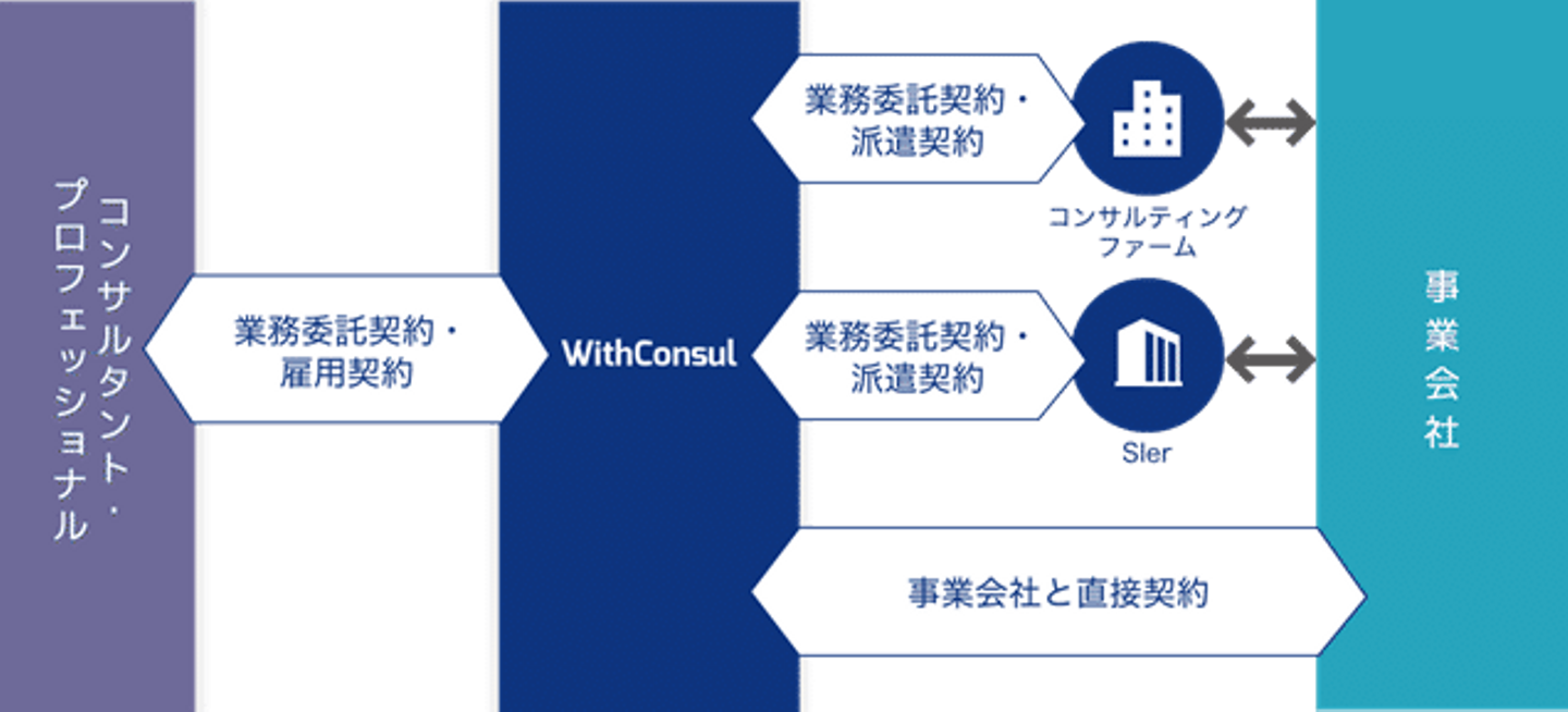 A:「WithConsul」は、経営課題を抱える企業と、コンサルティングファーム出身者や同等のスキルを持つプロフェッショナルをつなぐマッチングサービスです。