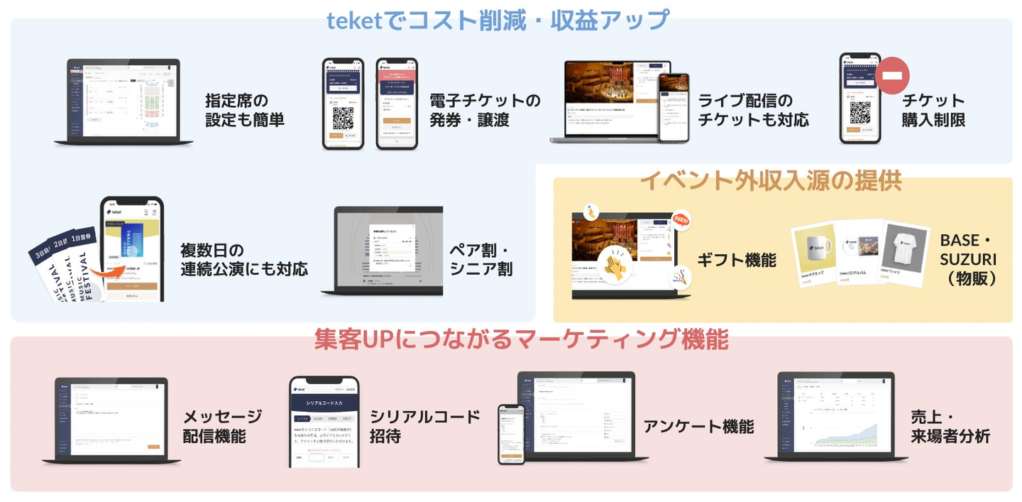 「teket」は、クラシック / 音楽ライブ / 舞台・演劇 / スポーツ / 自治体・行政イベントなどのあらゆるシーンでご利用いただける、電子チケット販売・管理サービスです。イベントページ作成から、チケット販売・売上管理にいたるまで、あらゆる機能を初期費用ゼロ・追加料金ゼロで利用できます。イベント規模やジャンルを問わずご利用いただける豊富な機能を提供し、アーティスト活動やイベント業務をサポートします。