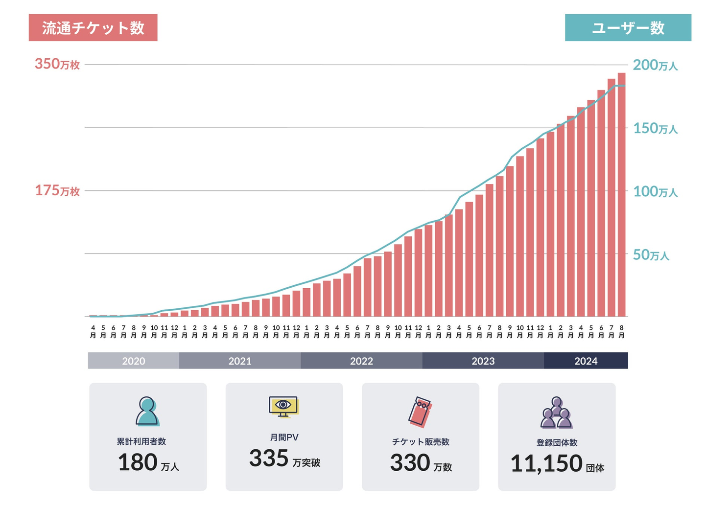 おかげさまで2024年8月時点で、累計チケット販売数が330万枚、総公演登録数が5万公演を突破。チケット流通総額は21億円となりました。累計利用者数は180万人を超え、10,000を超えるイベント主催者さまに登録いただいています。