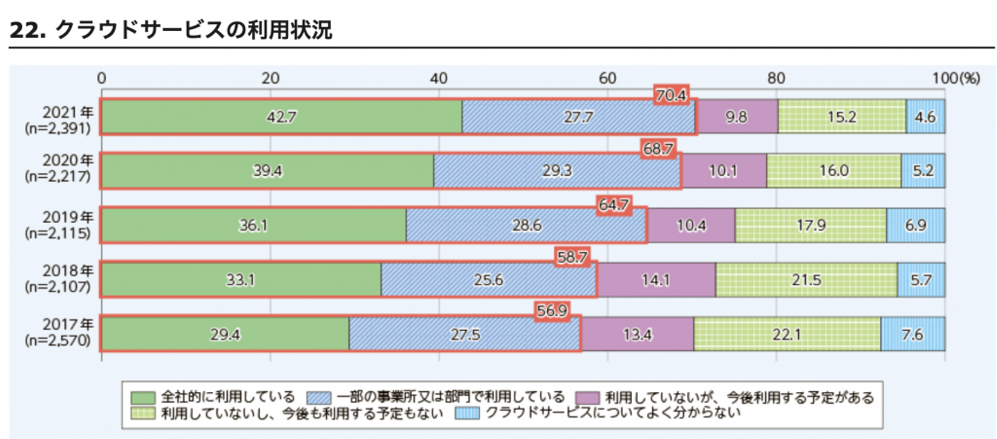 総務省の「令和4年版 情報通信白書」によると、クラウドサービスを利用している企業数は年々増加しているのが分かります。