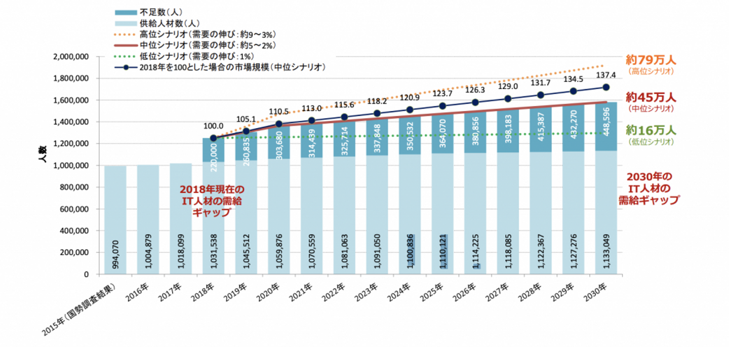 2019年に経済産業省が発表した「IT人材の需給に関する調査」によると、2030年にはエンジニアが最大79万人不足する見込みです。