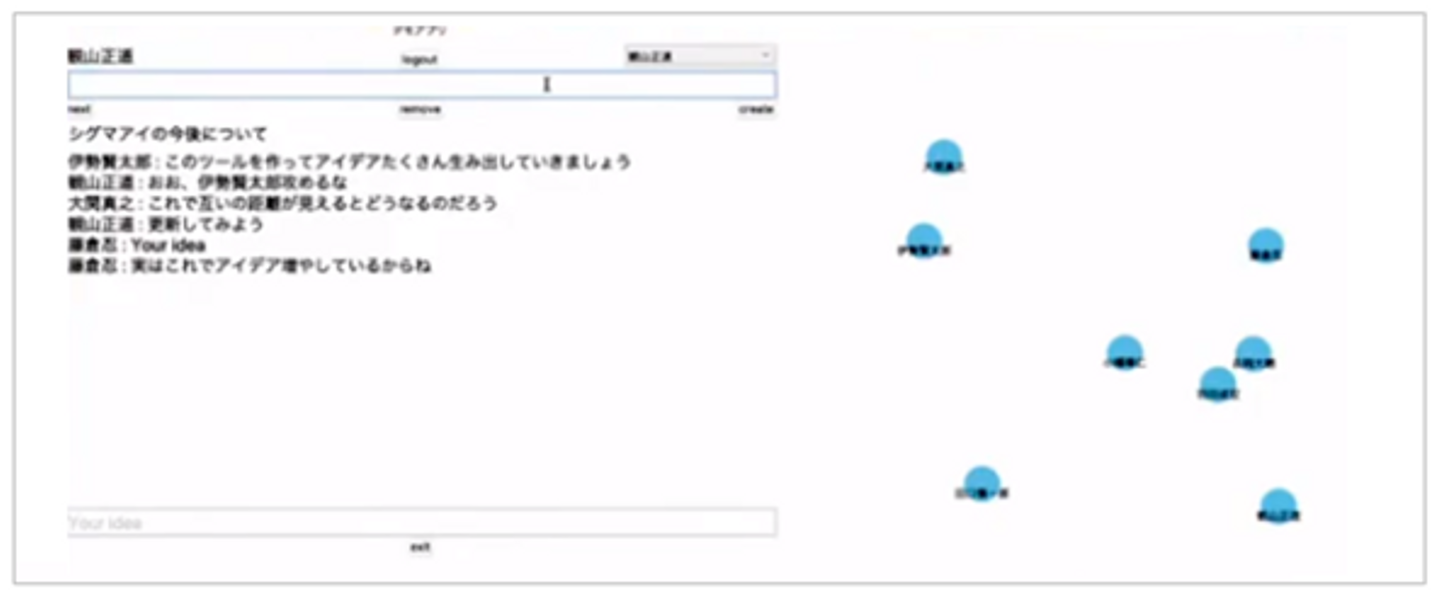 ここをちょっとブラックボックスにしているわけですよ。これが、どう言葉を入れていくと、どうコミュニケーションしていくと、マップが変わるかというのを探りながらやるわけですよね。そうすると、移動がちょっと不自由なわけですけど、ある種ブラックボックスになっているので、これで、例えばAさんとBさんが近づいてくれたということになれば、あ、俺とあの人、この話題で盛り上がると近づいていくんだということが分かります。あ、こいつと今ディスカッションするべきだなとか、そういうふうに、今みんながどういう状態にあるかの可視化もしているんですよ。