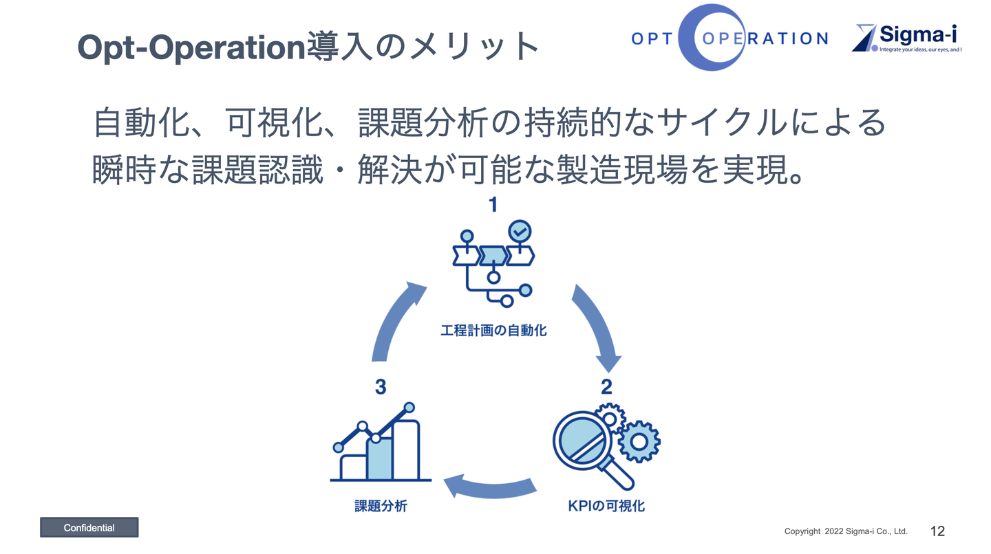 私たちのソリューションは、バリューチェーンの中でまずは「生産」に特化して、このような課題を解決するものです。メインのターゲットになるのが、「工程スケジュールの自動化・最適化」になります。現場での「知」を集約して、アルゴリズムに落とす。そして、常に環境の変化にも対応できる製造現場をつくるのが、「Opt-Operation」のコンセプトです。