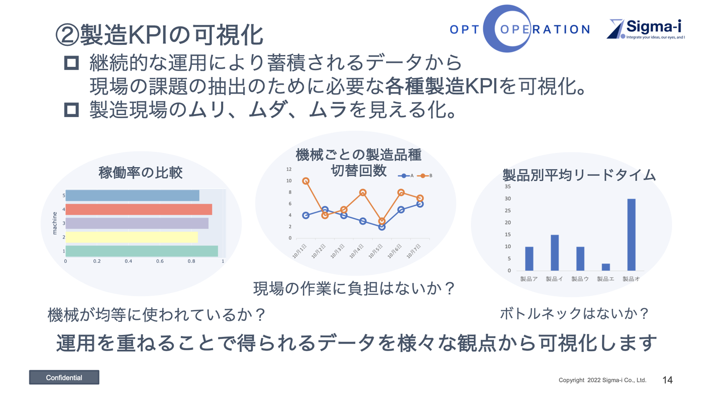 もう一つの提供している価値は、可視化です。継続的にこのサービスを運用することで、データが蓄積されていきます。その中で、現場の課題を抽出するために必要なKPIをすぐに可視化できるのです。「ムリ」「ムダ」「ムラ」の見える化、と言ってもいいと思います。製品ごとのリードタイムを可視化して、ボトルネックを抽出することも可能です。