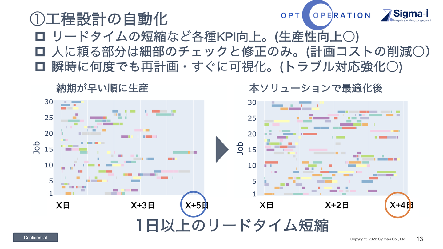 「工程計画の自動化」→「KPIの可視化」→「課題分析」のサイクルを回すソリューションです。蓄積されたデータを量子アニーリング技術で処理することによって、自動で工程計画を組むことができます。具体的にはこちらの図を見ていただければと思いますが、「Opt-Operation」を活用すれば、工程設計が自動化できるだけではありません。こちらの事例では、30個の製品をつくった場合に、1日以上のリードタイム短縮が可能になりました。ちなみに、この工程表は非常に短い時間で出すことができます。また、パラメーターを操作することで、リードタイム以外の指標を最適化することも可能です。これらの機能を提供することで、現場のニーズに合わせた自動化が実現できるのです。